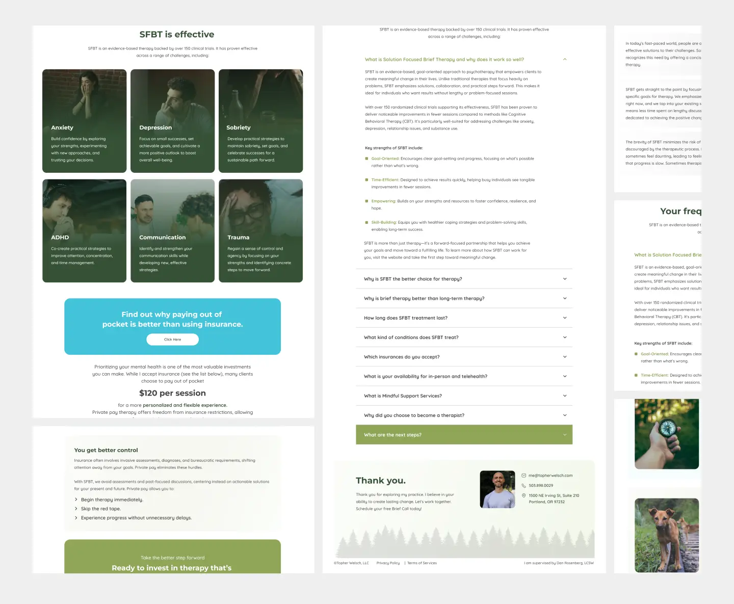 This project involved designing and developing a landing page for an individual therapist specializing in Solution-Focused Brief Therapy (SFBT). The primary objective was to create a calm, welcoming, and trustworthy digital experience that clearly explains the therapist’s approach while encouraging visitors to take the first step toward therapy.